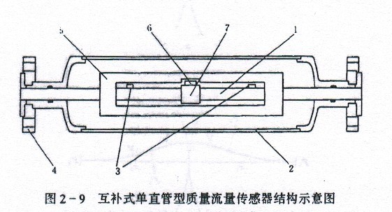 圖2 -9是一種(彈性平衡擺與測(cè)量管振動(dòng))互補(bǔ)式單直管型質(zhì)量流量傳感器的結(jié)構(gòu)示意圖。為了達(dá)到良好的振動(dòng)隔離效果,在測(cè)量管中部連接有一個(gè)彈性平衡擺,應(yīng)用動(dòng)量守恒定律和而可有效地消除單直管系統(tǒng)振動(dòng)的不平衡問(wèn)