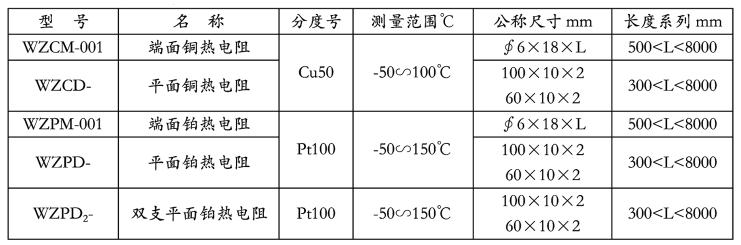 注:表格所列WZCPD- 平面銅、鉑電阻公稱尺寸為長×寬×厚。